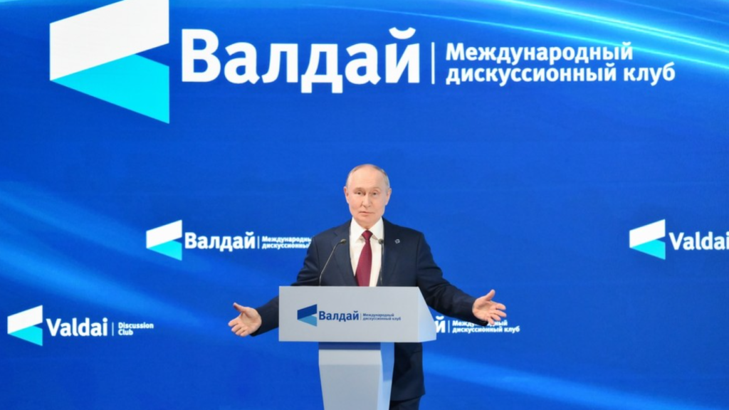 Russian President Vladimir Putin delivers a speech during a plenary session 'The Polycentric World: Instructions for Use' of the Valdai International Discussion Club in Sochi, Krasnodar region, Russia. © Sputnik / Grigory Sysoev