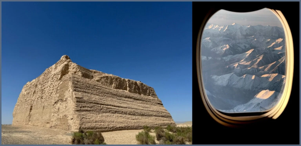 (L): The one and only Yumenguan – the Jade Gate Pass, marking the western limits of China for centuries. ; (R): Xinjiang. Flying over the Tian Shan mountains.