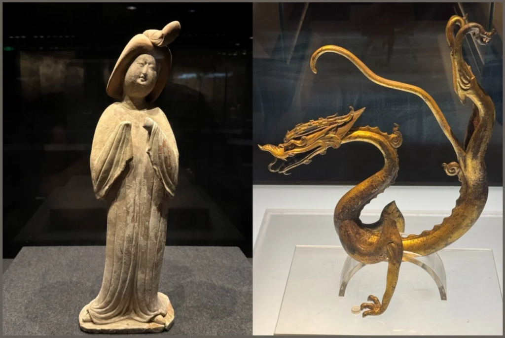 At the glorious Shaanxi History Museum in Xian. (L): Drop-dead chic Tang Barbie, where I had a fab Silk Roads conversation with one of the curators ; (R): Silk Road golden splendour