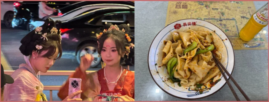 Xian. (L): TikTok Tang Barbies on a roll. ; (R): Happiness is a bowl of perfect lamian in the Muslim Quarter