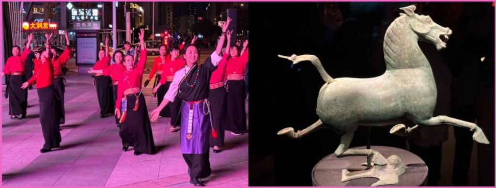 Lanzhou. (L): Downtown: dancin’ in the streets ; (R): The Flying Horse of Gansu: the epitome of Chinese bronze craftmanship