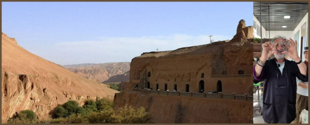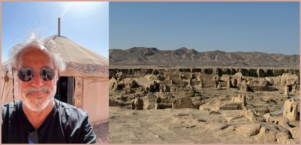 (L): At the Bezeklik Buddhist – and Manichean – caves, outside of the privileged oasis of Turfan. Classic Silk Road ; (R): Yutian. Carl Zha: [Pepe’s] holding up a $10,000 USD Hotan jade bracelet