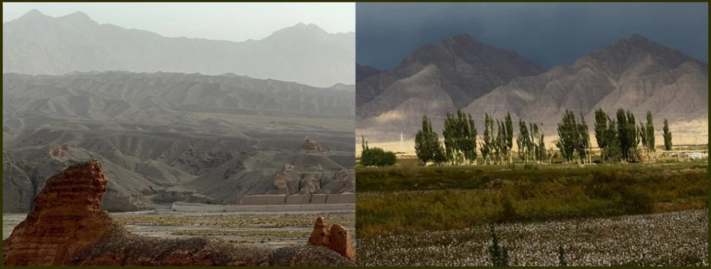 Xinjiang. (L): On the Northern Silk Road, from Aksu to Kucha ; (R): Northern Silk Road. Cotton fields. No slaves. No victims of “genocide”