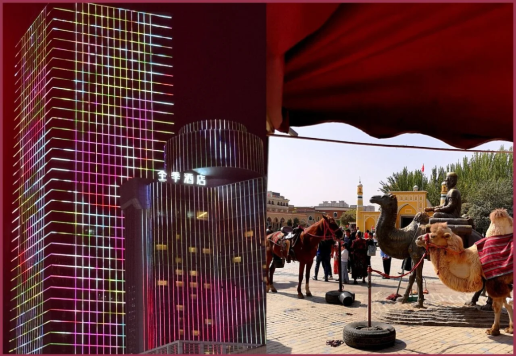 Xinjiang. (L): Urumqi – symbol of the development of the “Western regions” ; (R): Kashgar. In the Old City, in front of Id Kah mosque