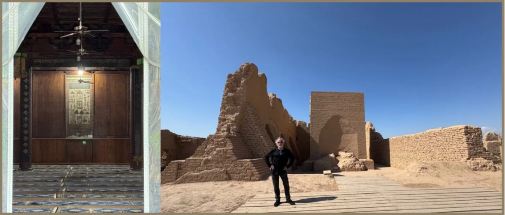 (L): Xian. At the Great Mosque. Having a fabulous time with the Hui. There are only 20k still living in Xian ; (R): Welcome to Xinjiang. At the astonishing 5th century ruins of Buddhist Gaochang kingdom