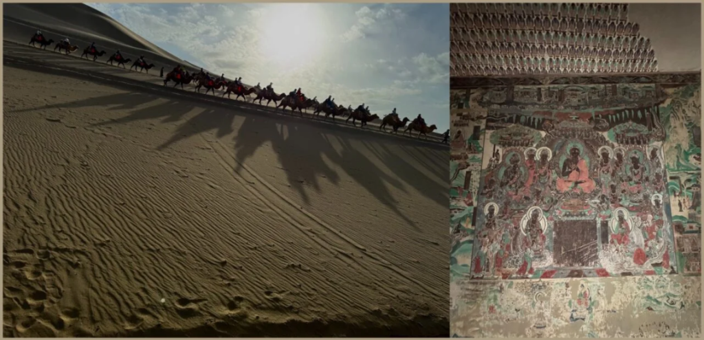 Dunhuang. (L): The All China Camel Caravan is on the move ; (R): The unparalleled beauty of the remaining Buddhist paintings in the Mogao caves