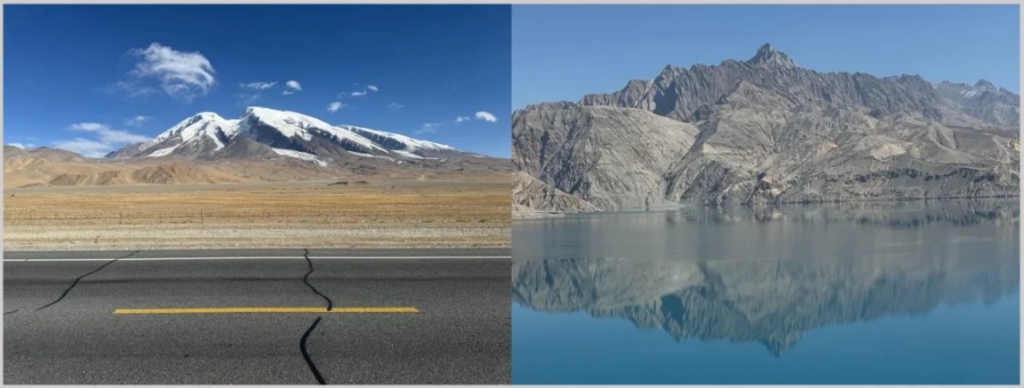 (L): Xinjiang meets Pamir lands. The Muztagh Ata blesses the Karakoram highway ; (R): Lake Karakul