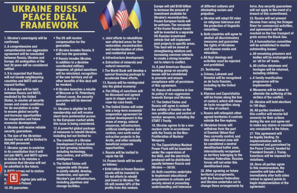 A full version of the alleged 28-point US drafted peace plan to bring an end to the war in Ukraine appeared on line courtesy of Ivan Katchanovski @I_Katchanovski (you can read the original post on X here). According to my friend, Pepe Escobar, this document was leaked to the Russian press by Kiril Dimitriev. This proposal is worse than I imagined. During an interview with Maria Zakharova that I hosted on Wednesday, along with Alexander Kazakov and Pepe Escobar, she stated that the Russian Foreign Ministry had not yet received an official copy of the proposal.
