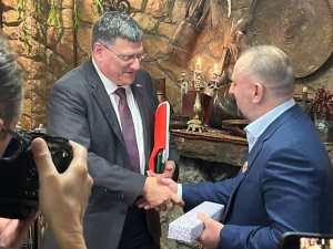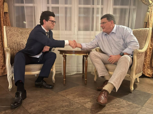 The Author (left) shakes hands with Sergei Aksyonov (right), the Governor of Crimea, January 2024