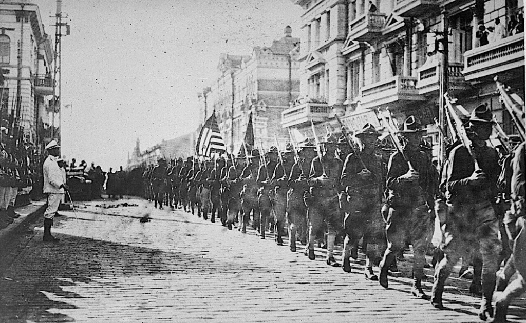 American troops in Vladivostok, Russia, parading before the building occupied by the staff of the Czecho-Slovaks. Japanese marines are standing to attention as they march by. Siberia, August 1918. (U.S. National Archives and Records Administration NARA/Wikimedia Commons)