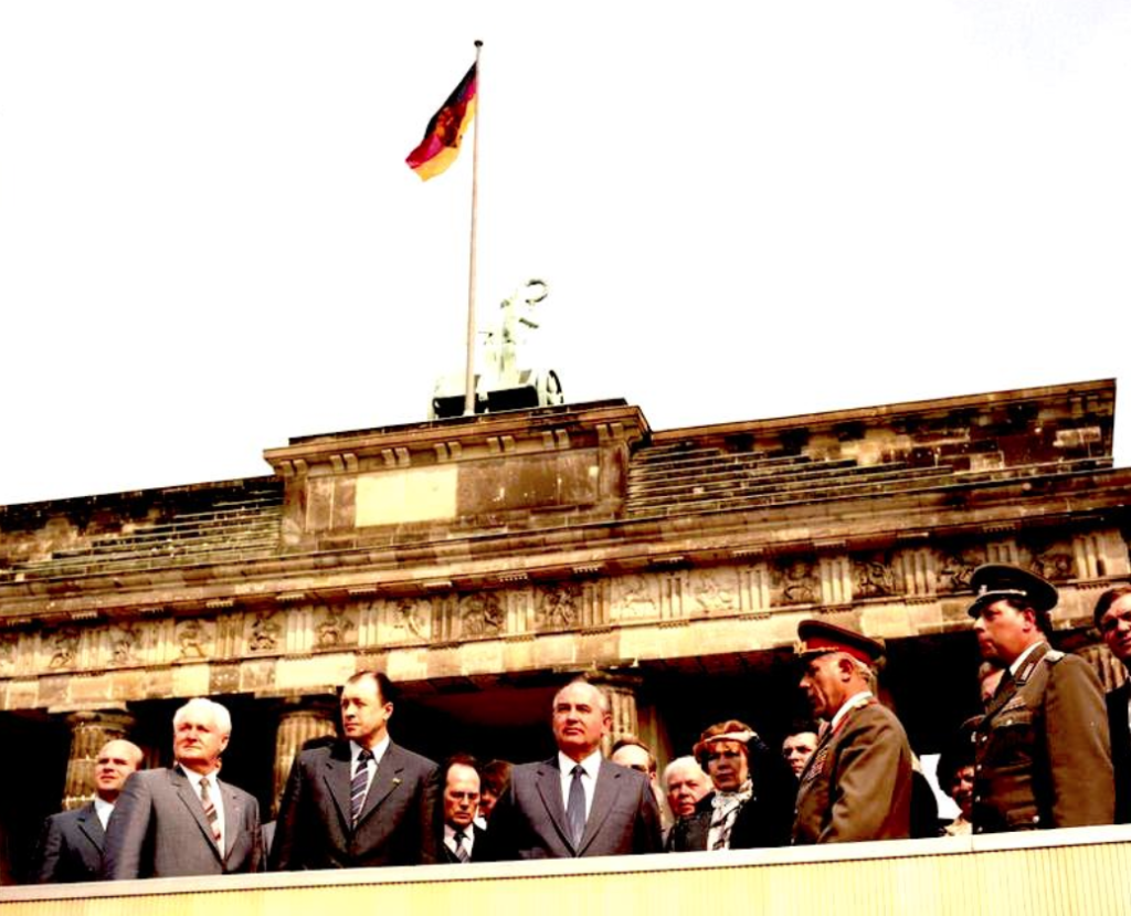 Soviet leader Mikhail Gorbachev at the Brandenburg Gate in 1986 during a visit to East Germany. (Bundesarchiv, Wikimedia Commons, CC-BY-SA 3.0)
