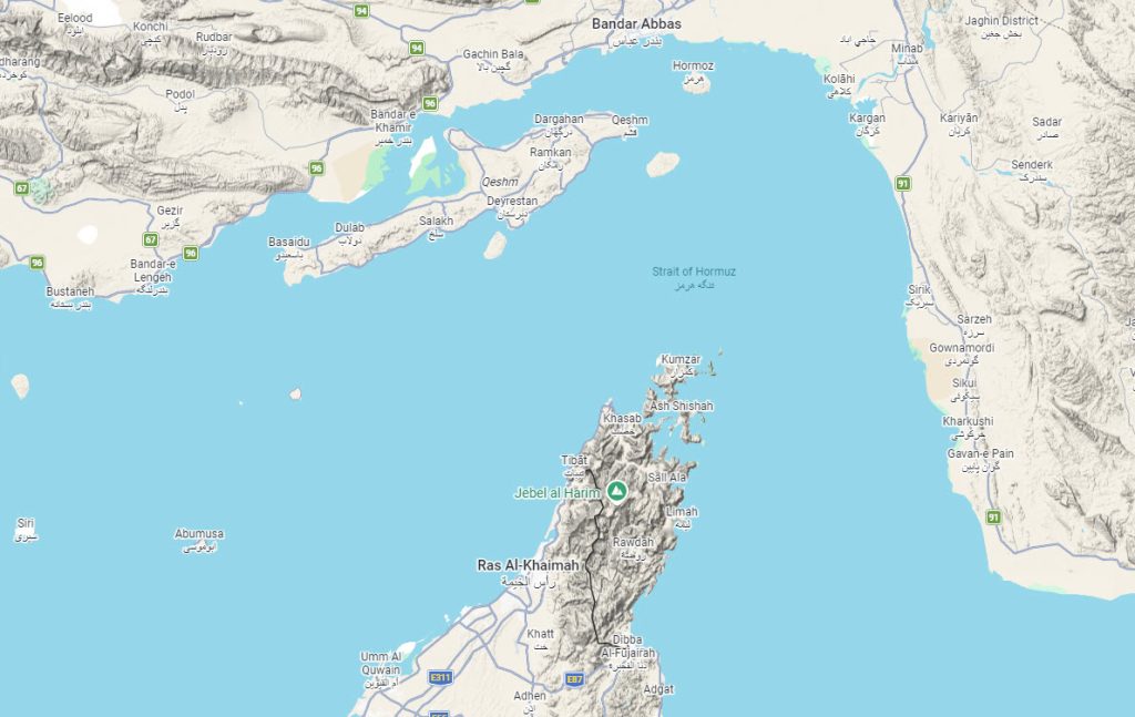 Check the first map to see where the "Strait of Hormuz" is located as the "choke point" just above Dubai on this map