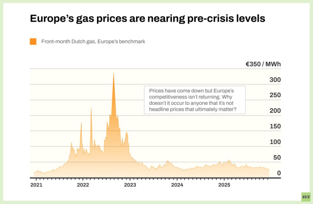 Bloomberg remarked in an article from December 2025 that the return of cheaper gas (compared with crisis levels) had not solved Europe’s energy crisis. It framed the issue as prices being almost back to normal but competitiveness still declining. The headline fact – gas prices in Europe had fallen to around €27/MWh – looks like vindication of the monetary framing. Prices have “normalized.” But normalized relative to what physical reality?