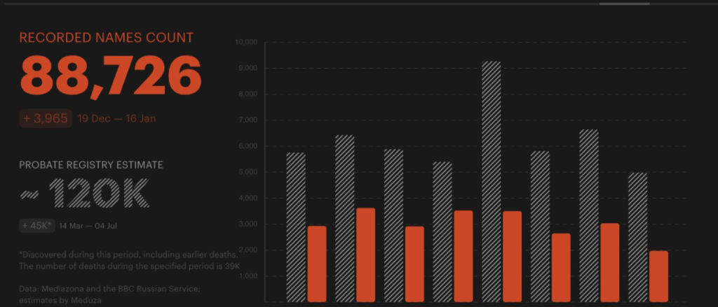 Mediazona is an independent organization that is ideologically opposed to Vladimir Putin. It is the antithesis of a Russian propaganda outlet. Mediazona employs a multi-faceted methodology to track Russian casualties in the Ukraine war, which includes: