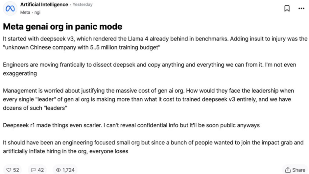 A message posted to Blind… has been making the rounds suggesting Meta is in crisis over the success of DeepSeek because of how quickly it surpassed Meta’s own efforts to be the king of open source AI with its Llama models.