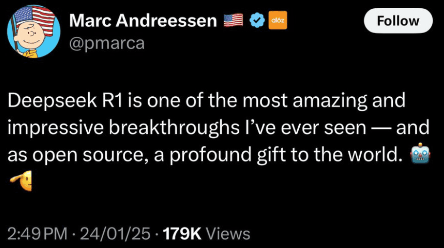 “There’s no overstating how profoundly this changes the whole game. And not only with regards to AI, it’s also a massive indictment of the US’s misguided attempt to stop China’s technological development, without which Deepseek may not have been possible…”