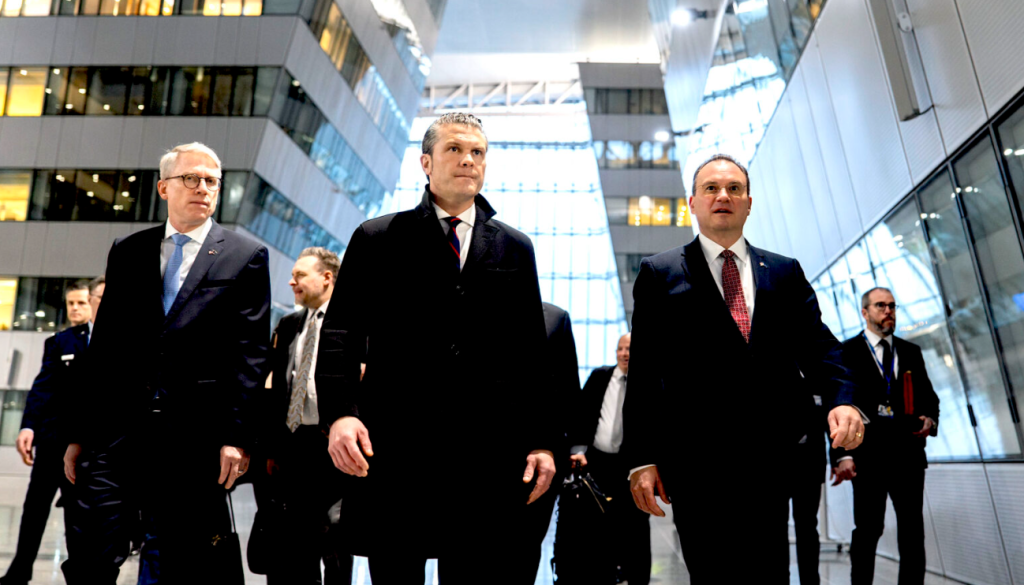 Hegseth, center, arriving at NATO headquarters in Brussels on Feb 12. (DoD, Alexander C. Kubitza)
