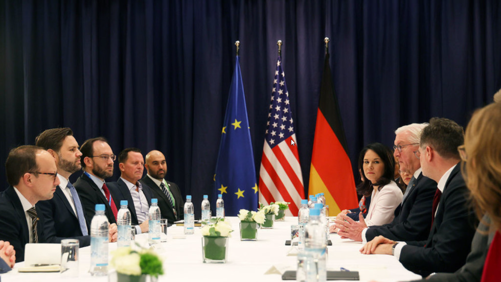US vice president JD Vance (2L) participates in a bilateral meeting with German Foreign minister Annalena Baerbock (6thL) and German president Frank-Walter Steinmeier (7thL) at the 61st Munich Security Conference on February 14, 2025 in Munich, Germany. © Getty Images / Getty Images