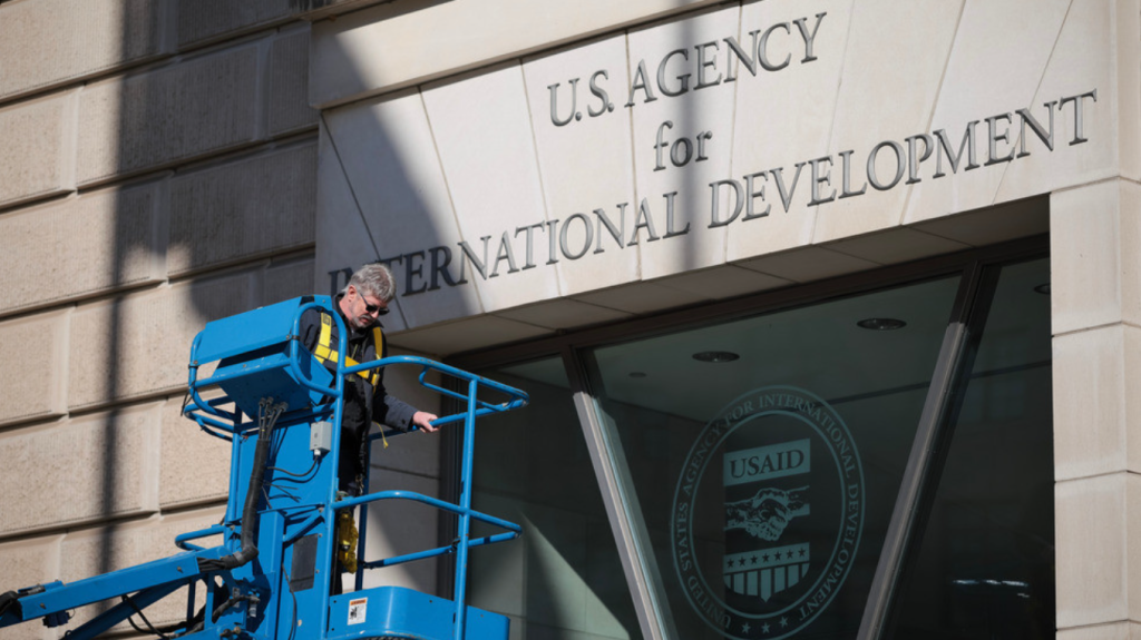 A worker removes the US Agency for International Development sign on February 07, 2025 in Washington, DC. © Getty Images