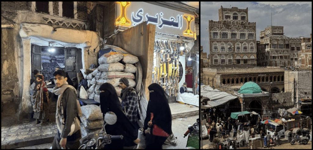 Sana’a: (L): Just a pilgrim taking stock of Saudi/US barbarity: the “coalition” that did NOT break Yemen. A two tap hit in a communal meeting. Over 1000 civilians killed, over 2000 wounded. (R): At al Sabeen park – ahead of the million people gathering next Friday.