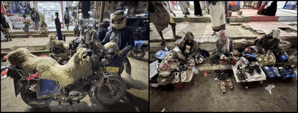 Saada, NW Yemen: at the souk (bazaar). (L): The Camel Silk Road China bike. (R): The sandal fixers. The people CENTCOM are bombing.