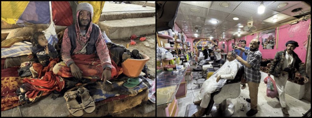Saada, NW Yemen: at the souk. (L): He’s got a steady job as a sandal fixer to support his daughter. (R): The Barber. The people CENTCOM are bombing.