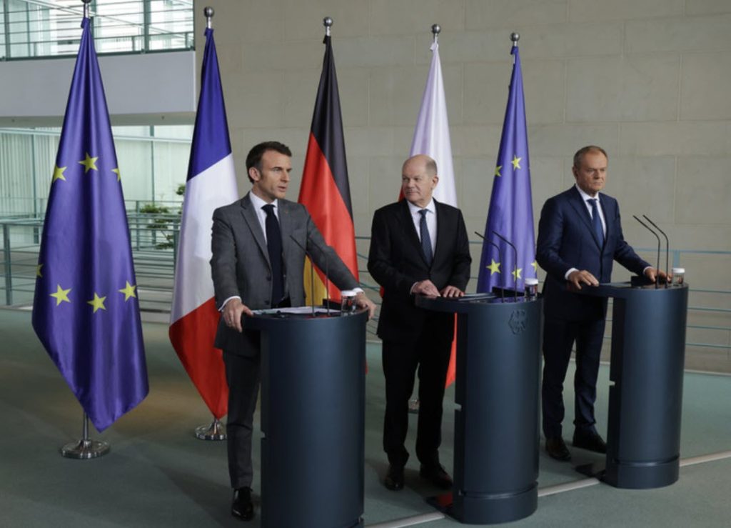 FILE PHOTO: French President Emmanuel Macron, German Chancellor Olaf Scholz, and Polish PM Donald Tusk. © Sean Gallup / Getty Images